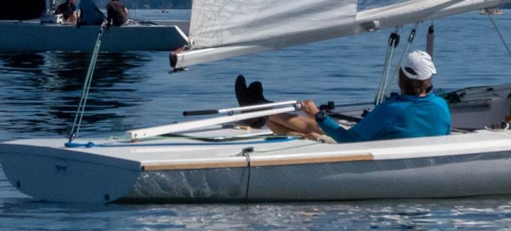 Einer der ganz wenigen Teilnehmer, die ohne fremde Hilfe auf eigenem Kiel bzw Schwert nach Hause kamen, war Stephan Lindner auf seiner 10m² Rennjolle hier vor Gstadt. Respekt!